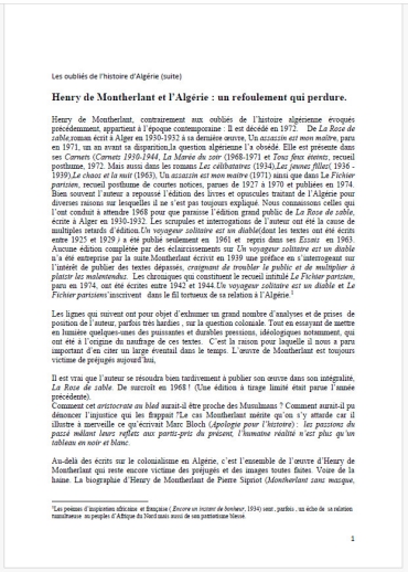 Le volume, particulièrement bien documenté et truffé de détails et récits, est publié dans la collection « Espaces interculturels » de la maison d’édition « L’Harmattan ». Il est comme une invitation proposée aux lecteurs pour découvrir, à travers une foule de récits, témoignages et textes, l’histoire de l’Algérie, celle de l’intime et de l’intérieur, qui est restée jusqu’à nos jours relativement peu connue et parfois même difficile à saisir. De fait, l’auteur, un ancien enseignant ayant coopéré en Algérie pendant plusieurs années, affirme que son livre constitue une sorte de quête qui aidera à sortir des oubliettes des Algériens et Algériennes, « hardis corsaires de l’époque ottomane, jeunes combattants intrépides faisant face à l’Infidèle, femmes héroïques des Hautes-Plaines dont la protestation véhémente demeure ignorée, Seigneurs du Sud admirés ou humiliés par les officiers français », et également ceux « restés dans l’ombre, condamnés politiques et déportés dans des bagnes ». Principalement dédié à ses anciens élèves du Sersou, dans les Hautes-Plaines, le livre est largement marqué par la production écrite de Germaine Tillion « dont les œuvres inspirent tout ce que j’écris sur l’Algérie » nous révèle MM. En outre, il faut prendre garde de signaler que le même MM souhaitait interroger un « tempo » algérien, voire un rythme temporel algérien, et essayé de le restituer comme une sorte de musique en se basant sur de nombreux matériaux et documents rares, précieux et parfois introuvables.